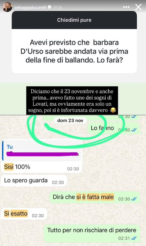 La scintilla scatta quando la giudice, rispondendo alle domande dei follower, rende pubblica una chat datata 23 novembre. Nel messaggio si legge un’ipotesi precisa: Barbara potrebbe “andarsene prima” e potrebbe dichiarare di essersi fatta male per giustificare il ritiro.