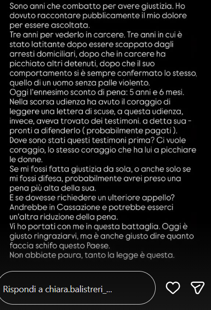 Per concludere, Chiara, ha affermato: “E se dovesse richiedere un ulteriore appello? Andrebbe in Cassazione e potrebbe esserci un’altra riduzione della pena. Vi ho portati con me in questa battaglia. Oggi è giusto ringraziarvi, ma è anche giusto dire quanto faccia schifo questo Paese. Non abbiate paura, tanto la legge è questa”. Che cosa ne pensate delle parole della Balistreri?