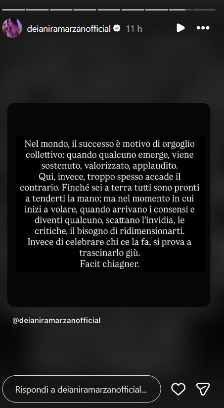 Ecco riportate, di seguito, le dichiarazioni di Deianira Marzano: “Nel mondo, il successo è motivo di orgoglio collettivo: quando qualcuno emerge, viene sostenuto, valorizzato, applaudito. Qui, invece, troppo spesso accade il contrario. Finché sei a terra tutti sono pronti a tenderti la mano; ma nel momento in cui inizi a volare, quando arrivano i consensi e diventi qualcuno, scattano l’invidia, le critiche, il bisogno di ridimensionarti. Invece di celebrare chi ce la fa, si prova a trascinarlo giù”.