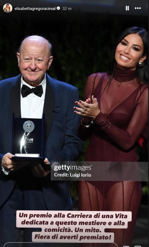 In una delle sue Instagram Stories, Gregoraci appare accanto Massimo Boldi, al quale è stato conferito il Premio alla Carriera per una vita interamente dedicata alla recitazione e alla comicità. L’atmosfera è quella delle grandi occasioni: abito elegante, sorrisi e un sincero tributo a un artista che ha segnato intere generazioni.