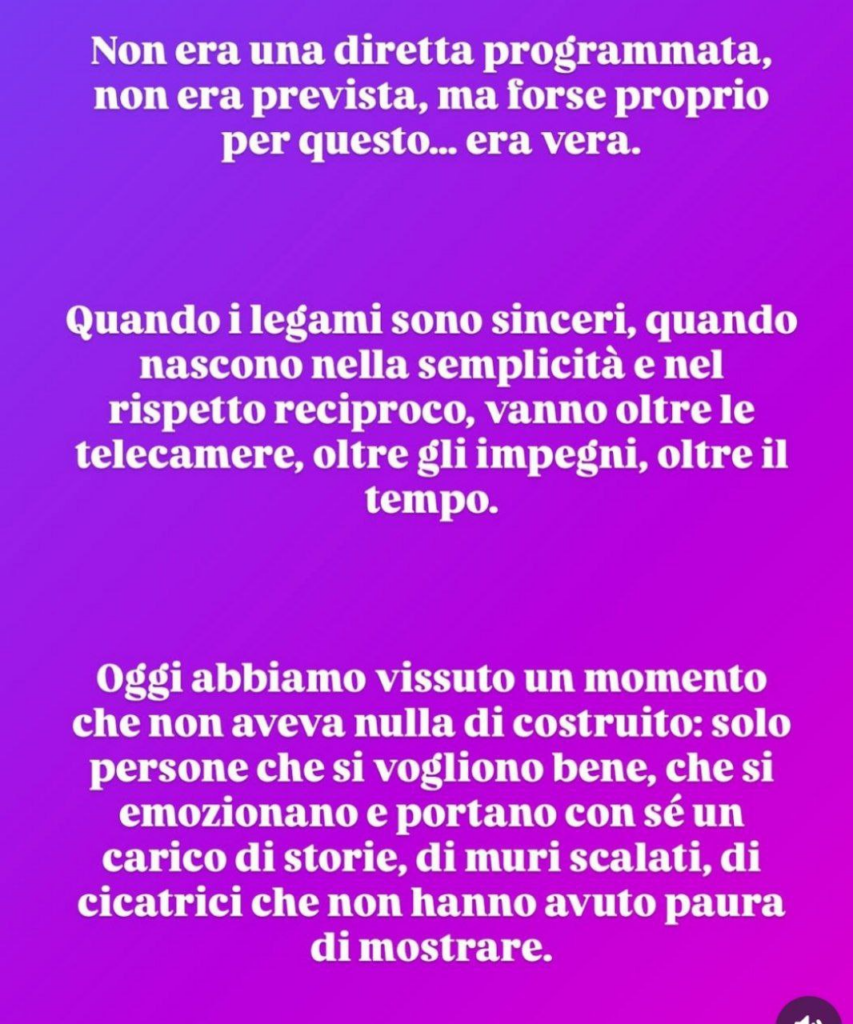 Infine, ha affermato: “Quella con Helena e Javier non era una diretta programmata, non era prevista, ma forse proprio per questo… era vera. Quando i legami sono sinceri, quando nascono nella semplicità e nel rispetto reciproco, vanno oltre le telecamere, oltre gli impegni, oltre il tempo. Oggi abbiamo vissuto un momento che non aveva nulla di costruito: solo persone che si vogliono bene, che si emozionano e portano con sé un carico di storie, di muri scalati, di cicatrici che non hanno avuto paura di mostrare“.