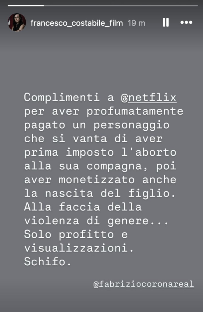 Ecco riportate, di seguito, le dichiarazioni dell’artista italiano d’origine: “Complimenti a Netflix per aver profumatamente pagato un personaggio che si vanta di aver imposto l’aborto alla sua compagna, poi aver monetizzato anche la nascita del figlio. Alla faccia della violenza di genere.. Solo profitto e visualizzazioni”.