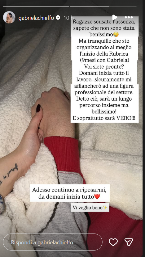 Ecco riportate, di seguito, le dichiarazioni di Gabriela: “Ragazze scusate l’assenza, sapete che non sono stata benissimo. Ma tranquille che sto organizzando al meglio l’inizio della Rubrica (9 mesi con me). Voi siete pronte? Domani inizia tutto il lavoro… sicuramente mi affiancherò a una figura professionale del settore. Detto ciò, sarà un lungo percorso insieme ma bellissimo! E soprattutto sarà vero!”.