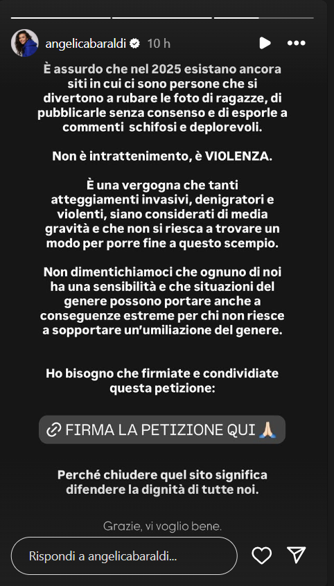 Angelica ha scritto: “Trovo assurdo che nel 2025 esistano ancora siti in cui ci sono persone che si divertono a rubare le foto di ragazze, di pubblicarle senza consenso e di esporle a commenti schifosi e deplorevoli. Non è intrattenimento, è violenza. E’ una vergogna che tanti atteggiamenti invasivi, denigratori e violenti, siano considerati di media gravità e che non si riesca a trovare un modo per porre fine a questo scempio. Non dimentichiamoci che ognuno di noi ha una sensibilità e che situazioni del genere possono portare anche a conseguenze estreme per chi non riesce a sopportare un’umiliazione del genere, inflitta da qualche utente”.