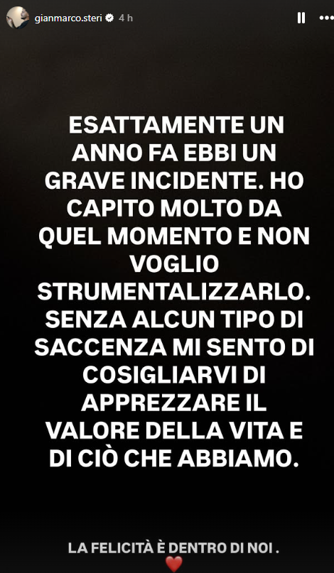 “Esattamente un anno fa ebbi un grave incidente. Ho capito molto da quel momento e non voglio strumentalizzarlo“, scrive Steri in una story Instagram, sottolineando come quell’esperienza lo abbia spinto ad apprezzare il valore della vita e di ciò che si possiede.
