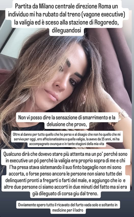 Ecco riportate, di seguito, le sue dichiarazioni: “Partita da Milano centrale direzione Roma un individuo mi ha rubato dal treno (vagone executive) la valigia ed è sceso alla stazione di Rogoredo, dileguandosi. Non vi posso dire la sensazione di smarrimento e la delusione che provo. Oltre al danno per tutto quello che ho perso e al disagio che non ho quello che mi serviva per oggi, ero affezionatissima a quella valigia, la avevo da 15 anni, mi ha accompagnato ovunque e in tante stagioni della mia vita“.