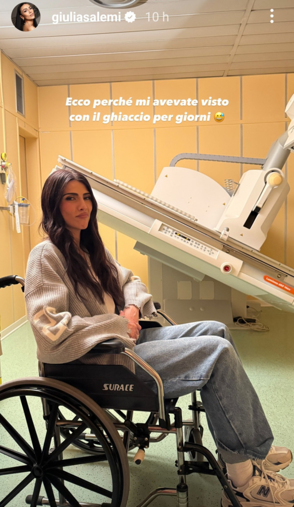 Nelle ultime ore, Giulia Salemi ha spiazzato i fan pubblicando una foto direttamente da un ambiente medico, seduta su una sedia a rotelle e con un’espressione ironica ma provata. La frase che accompagna lo scatto, “Ecco perché mi avevate visto con il ghiaccio per giorni”, lascia intendere che l’influencer e conduttrice abbia subito un infortunio non da poco, che ha richiesto accertamenti clinici e un probabile stop forzato dalle sue attività quotidiane.