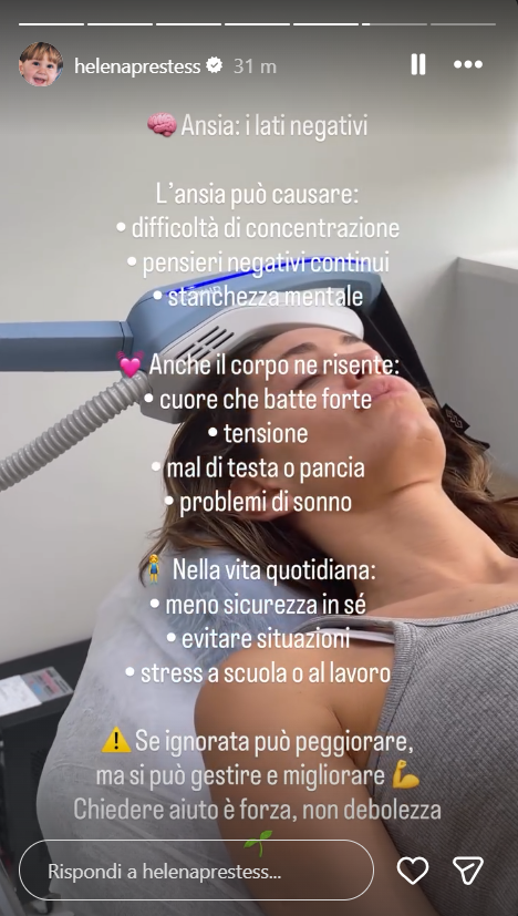 Ecco riportate, di seguito, le dichiarazioni di Helena: “L’ansia può causare: difficoltà di concentrazione, pensieri negativi continui, stanchezza mentale. Anche il corpo ne risente: cuore che batte forte, tensione, mal di testa o pancia, problemi di sonno”.