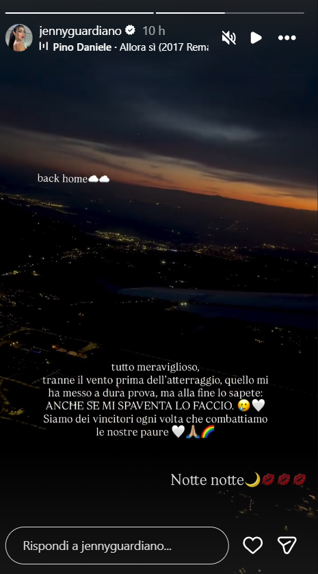 Ecco riportate, di seguito, le dichiarazioni di Jenny: “Tutto meraviglioso. Back home. Tranne il vento prima dell’atterraggio, quello mi ha messo a dura prova, ma alla fine lo sapete: anche se mi spaventa lo faccio. Siamo dei vincitori ogni volta che combattiamo le nostre paure. Notte notte”.