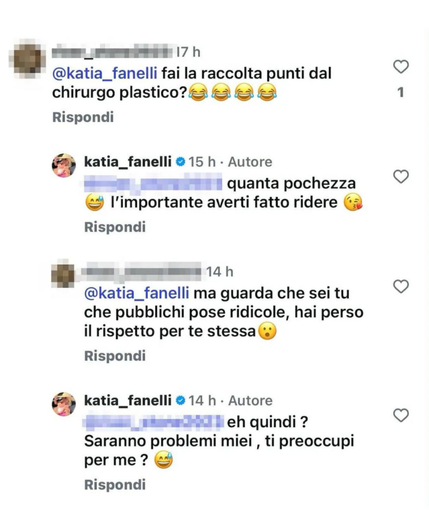 L’utente ha proseguito, commentando: “Sei fatta di punture, truccata al massimo, di naturale hai solo il cappello. Voce invitante? Invitante a scappare”. E Katia ha risposto: “Sei di una pochezza unica, mi fai pure tenerezza. Uomini come te dovrebbero sotterrarsi”.
