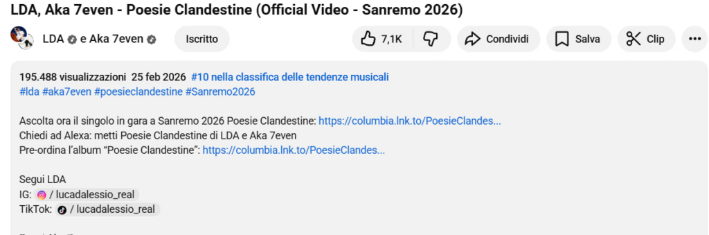 La loro canzone, che può essere una dedica a una fidanzata, a un’amica speciale o un inno alla città di Napoli, ottiene anche il 10°posto nella sezione tendenze per la musica su YouTube Italia, con più di 200mila ascolti complessivi in meno di 48 ore.