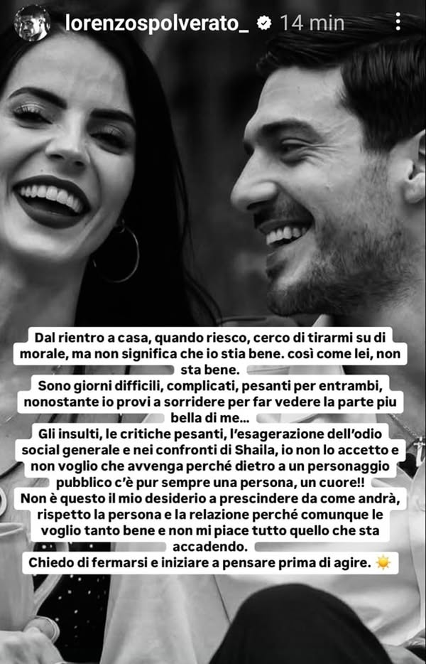 A sorpresa, proprio Lorenzo è intervenuto in sua difesa, chiedendo pubblicamente di fermare l’odio social: “Dal rientro a casa, quando riesco, cerco di tirarmi su di morale, ma non significa che io stia bene. Così come lei, non sta bene. Gli insulti, le critiche pesanti, l’esagerazione dell’odio social nei confronti di Shaila, io non lo accetto. Dietro a un personaggio pubblico c’è una persona, un cuore. Le voglio ancora tanto bene.”