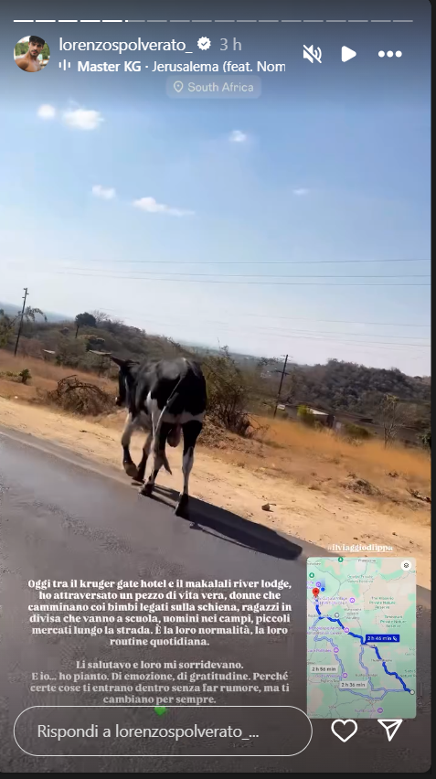 Ecco riportate, di seguito, le dichiarazioni di Spolverato sui social: “Oggi tra il kruger gate hotel e il makatali river bridge, ho attraversato un pezzo di vita vera, donne che camminano coi bimbi legati sulla schiena, ragazzi in divisa che vanno a scuola, uomini nei campi, piccoli mercati lungo la strada.. è la loro normalità. La loro routine quotidiana”.
