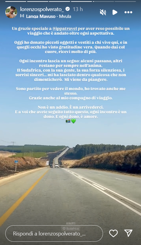 Ecco riportate, di seguito, le dichiarazioni di Lorenzo sui social: “Un grazie speciale a Ippa Travel per aver reso possibile un viaggio che è andato oltre ogni aspettativa. Oggi ho donato piccoli oggetti e vestiti a chi vive qui, e in quegli occhi ho visto gratitudine vera. Quando dai col cuore, ricevi molto di più. Ogni incontro lascia un segno: alcuni passano, altri restano per sempre nell’anima. Il Sudafrica, con la sua gente, la sua forza silenziosa, i sorrisi sinceri… mi ha lasciato dentro qualcosa che non dimenticherò. Mi viene da piangere”.