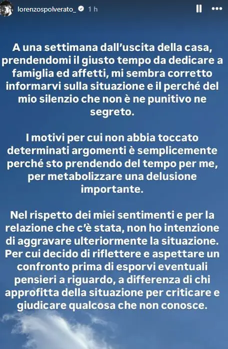 “A una settimana dall’uscita della casa, prendendomi il giusto tempo da dedicare a famiglia ed affetti, mi sembra corretto informarvi sulla situazione e il perché del mio silenzio che non è ne punitivo ne segreto. I motivi per cui non abbia toccato determinati argomenti è semplicemente perché sto prendendo del tempo per me, per metabolizzare una delusione importante. Nel rispetto dei miei sentimenti e per la relazione che c’è stata, non ho intenzione di aggravare ulteriormente la situazione. Per cui decido di riflettere e aspettare un confronto prima di esporvi eventuali pensieri a riguardo, a differenza di chi approfitta della situazione per criticare e giudicare qualcosa che non conosce, ed ancora: