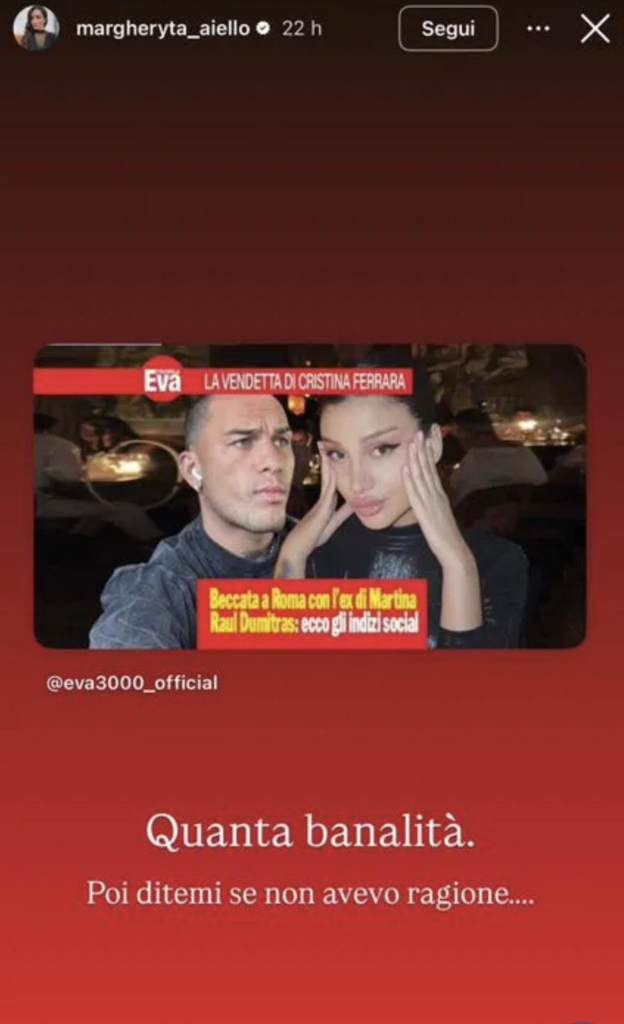 MARGHERITA AIELLO VUOTA IL SACCO SU CRISTINA E RAUL: LE PAROLE DELL’EX DAMA DI UOMINI E DONNE SU INSTAGRAM (FOTO)- Nel corso delle ultime ore, dopo la chiacchierata rottura definitiva con Gianmarco Steri, ex Tronista di Uomini e Donne, Cristina è stata beccata in compagnia di Raul Dumitras, vecchia fiamma di Martina De Ioannon. Ora, a commentare questo flirt, è intervenuta anche Margherita, ex dama del celebre dayting show di Canale5 al cui timone troviamo Maria De Filippi. Sentite cos’ha dichiarato nel dettaglio la Aiello sul suo profilo Instagram ufficiale.