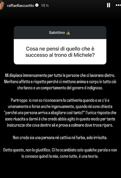 Ecco le dichiarazioni della Scuotto: “Mi dispiace immensamente per tutte le persone che ci lavorano dietro. Maritano affetto e rispetto perché ci mettono anima e corpo in tutto ciò che fanno e un comportamento del genere è poco dignitoso. Purtroppo io non so riconoscere la cattiveria quando e se c’è e umanamente e forse anche ingenuamente, quando mi sono chiesta ‘perché una persona arriva a sbagliare così tanto?ì l’unica risposta che sono riuscita a darmi è che credo abbia agito in questo modo per tante insicurezze che cova dentro sé e prova a colmare dove trova riparo”.