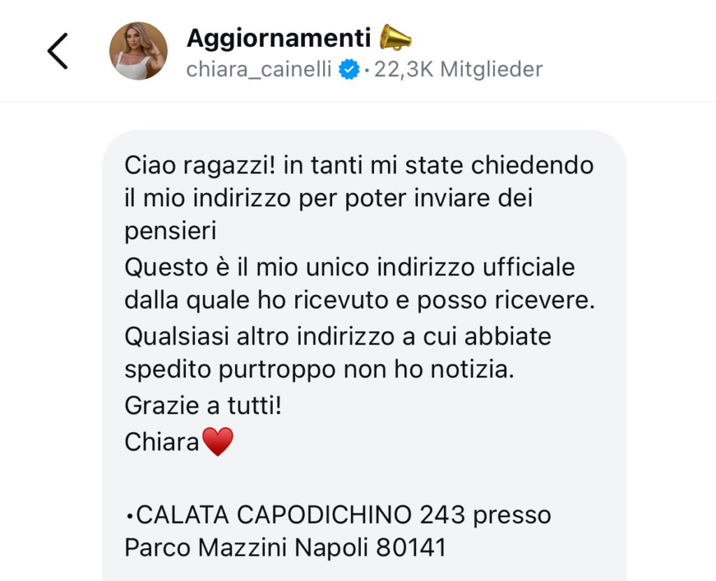 Chiara Cainelli ha recentemente pubblicato un messaggio sui suoi canali social per chiarire una questione che ha destato confusione tra i suoi sostenitori: “Ciao ragazzi! In tanti mi state chiedendo il mio indirizzo per poter inviare dei pensieri. Questo è il mio unico indirizzo ufficiale dalla quale ho ricevuto e posso ricevere. Qualsiasi altro indirizzo a cui abbiate spedito purtroppo non ho notizia. Grazie a tutti!”. Un post semplice, ma necessario per evitare che doni e lettere finiscano in mani sbagliate.