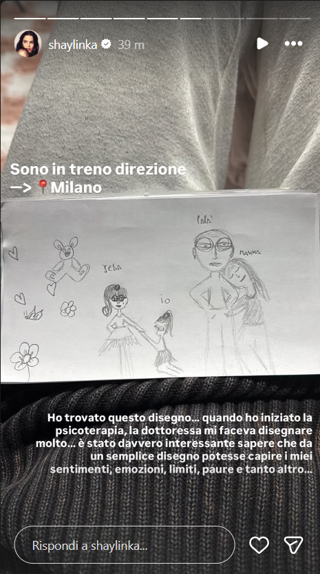 Ecco riportate, di seguito, le dichiarazioni di Shaila Gatta: “Sono in treno direzione Milano. Ho trovato questo disegno.. quando ho iniziato la psicoterapia, la dottoressa mi faceva disegnare molto.. è stato davvero interessante sapere che da un semplice disegno potesse capire i miei sentimenti.. emozioni, limiti, paure e tanto altro..”.