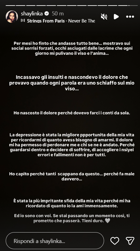 La Gatta ha scritto: “Per mesi ho finto che andasse tutto bene… mostravo sui social sorrisi forzati, occhi asciugati dalle lacrime che ogni giorno mi pulivano il viso e l’anima…”, ha esordito Shaila.