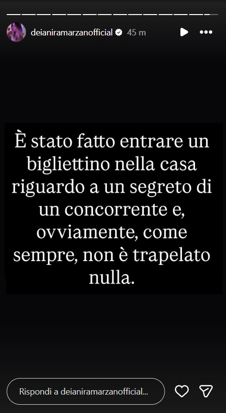 Ecco riportate, di seguito, le dichiarazioni di Deianira Marzano sul suo profilo Instagram ufficiale: “E’ stato fatto entrare un bigliettino nella casa riguardo a un segreto di un concorrente e, ovviamente, come sempre, non è trapelato nulla“.