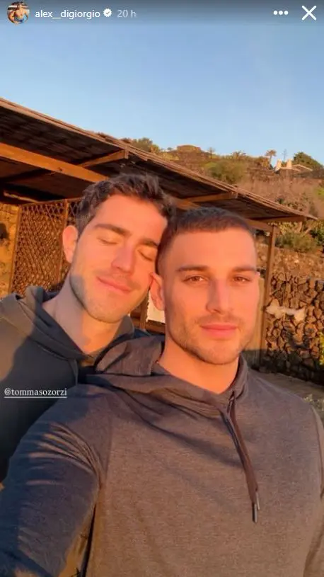 Nella foto condivisa su Instagram, Alex Di Giorgio e Tommaso Zorzi appaiono vicinissimi. Il campione di nuoto è in primo piano, mentre Tommaso si appoggia a lui con gli occhi chiusi, in un gesto che parla di intimità e fiducia. L’atmosfera è quella di un tramonto pantesco: luce dorata, paesaggio rurale e un senso di pace che rende lo scatto quasi cinematografico.