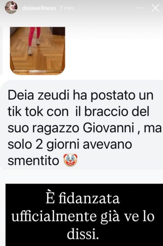 Ecco quanto riportato da Deianira Marzano su Instagram: “Zeudi ha postato un tik tok con il braccio del suo ragazzo, Giovanni, ma solo 2 giorni fa avevano smentito.. è fidanzata ufficialmente… già ve lo dissi”.